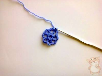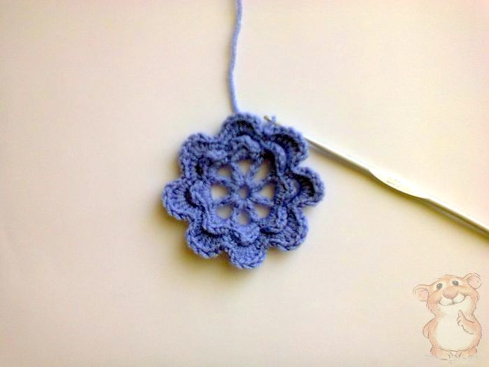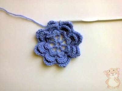 Снова делаем перемычки для нового ряда лепестков. Вяжем по 6 воздушных петель. Третий ряд лепестков вяжется по аналогии со вторым.