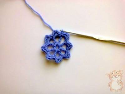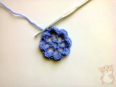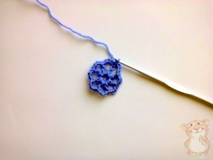 Теперь в соответствии со схемой необходимо сделать перемычки из 6 воздушных петель. Я сократила количество петель до пяти. Итак, вяжем цепочки из 5 воздушных петель, прикрепляя их соединительной петлей в местах соединения лепестков предыдущего ряда.