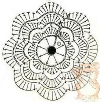 Вводя крючок за получившиеся перемычки, вяжем новый ряд лепестков: 2 столбика без накида, 5 столбиков с накидом, 2 столбика без накида. Повторяем указанные действия, замыкаем ряд.