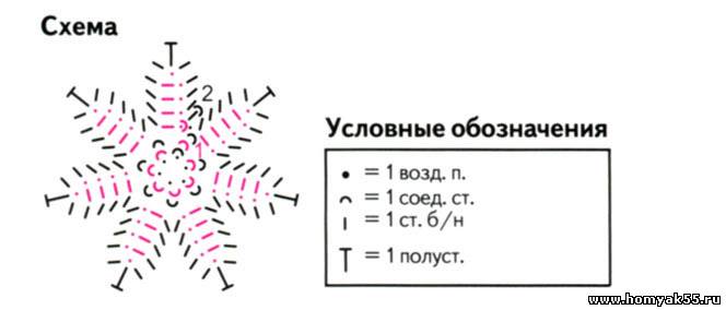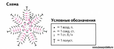 Оранжевой, белой или сиреневой нитью свяжите цепочку из 6 воздушных петель (ВП) и сомкните её 1 соединительным столбиком (СС) в кольцо. Далее вяжите круг. рядами по схеме. Накрахмальте цветки и насадите их на стебли.Журнал "Диана креатив", 2012
