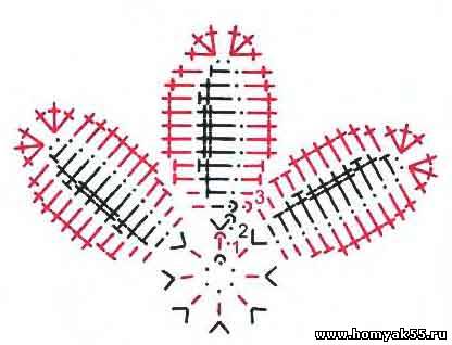 Набрать 6 ВП из пряжи желаемого цвета, замкнуть ПС в кольцо и вязать согласно схеме. Для наглядности показана лишь часть мотива = 8 лепестков.