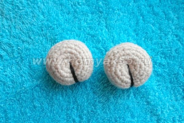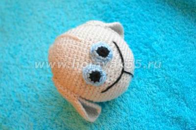 Сшиваем все детали головы: уши складываем пополам и пришиваем их к голове в сложенном виде. Глаза можно связать отдельно (как в моем случае), вышить или заменить пуговицами.