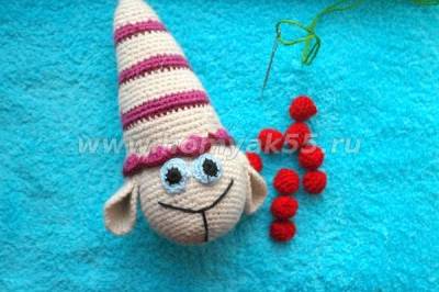 Колпак также неплотно набиваем синдепухом и пришиваем его к голове овечки.
