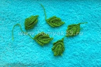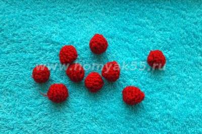 Украшать колпак будем «вишенками». Для этого понадобится связать несколько ягодок и листочков.