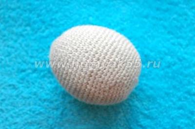 Голову будущей овечки вяжем диаметром около 10 сантиметров. Не плотно набиваем ее синдепухом, чтобы она не была тяжелой и зашиваем края.