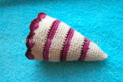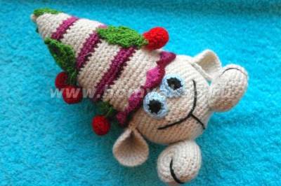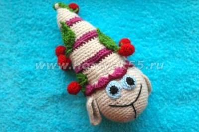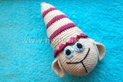 Чтобы связать колпак, используем 3 цвета пряжи. Сначала делаем кольцо из воздушных петель по диаметру головы овечки, колпак вяжем по спирали, равномерно убавляя петли по секторам и чередуя цвета. А затем по краю начального ряда провязать узор «ракушки» или «рачий шаг».
