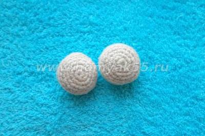 Для лапок вяжем 2 «таблетки» по 3 сантиметра в диаметре, потом делаем подъем и, набив лапки синдепухом, зашиваем.