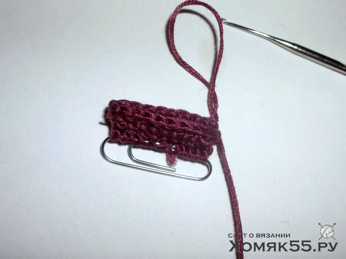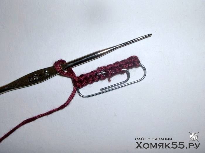 Теперь разворачиваем скрепку. И нам нужно будет вязать по другой стороне. В самую первую петельку провязываем столбик с накидом. И во все следующие девять петель тоже вяжем по одному столбику. Все столбики нам нужно вязать за переднюю стенку петелек.