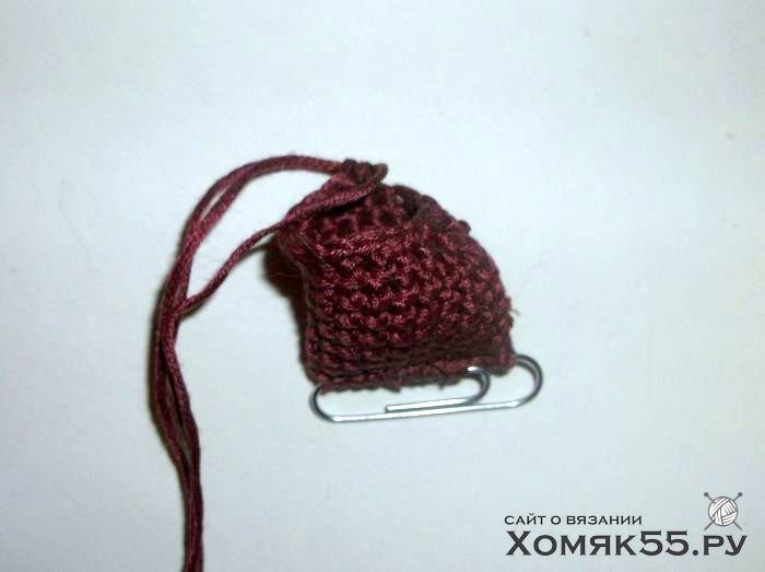 Берем обычную канцелярскую скрепку и начинаем обвязывать одну ее сторону столбиками без накида. Всего нам нужно провязать внутрь скрепки десять столбиков. Мы вводим крючок внутрь канцелярской скрепки и вытаскиваем нитку. Провязываем ее. Повторяем еще девять раз.