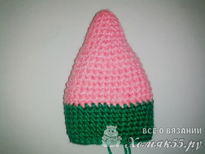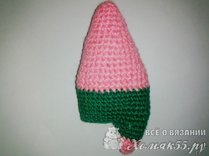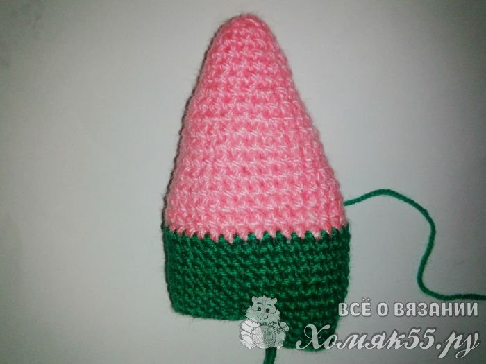 Сменим розовые нитки на зеленые. Свяжем семь рядов и в восьмом сделаем пять убавок.