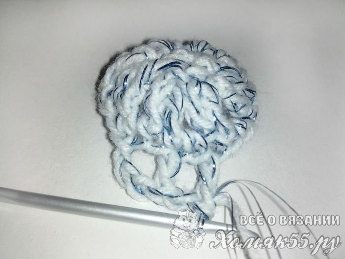 Сначала свяжем три воздушные петельки и провяжем соединительную петлю в третью. Теперь в получившееся кольцо свяжем семь столбиков без накида.