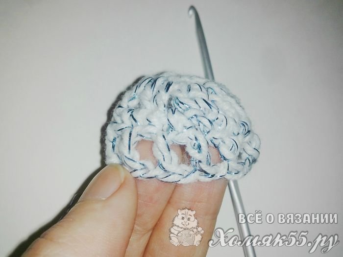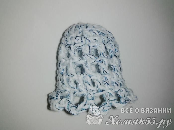 И свяжем последний ряд колокольчика. Делаем четыре воздушные петельки и провязываем столбик без накида во вторую петельку основания, то есть одну пропускаем, в следующую вяжем. Снова делаем четыре воздушные петли и повторяем вязание по кругу до конца этого ряда.