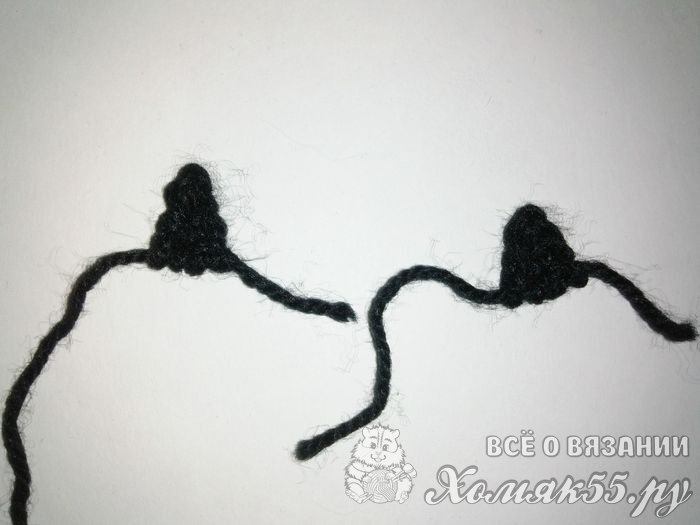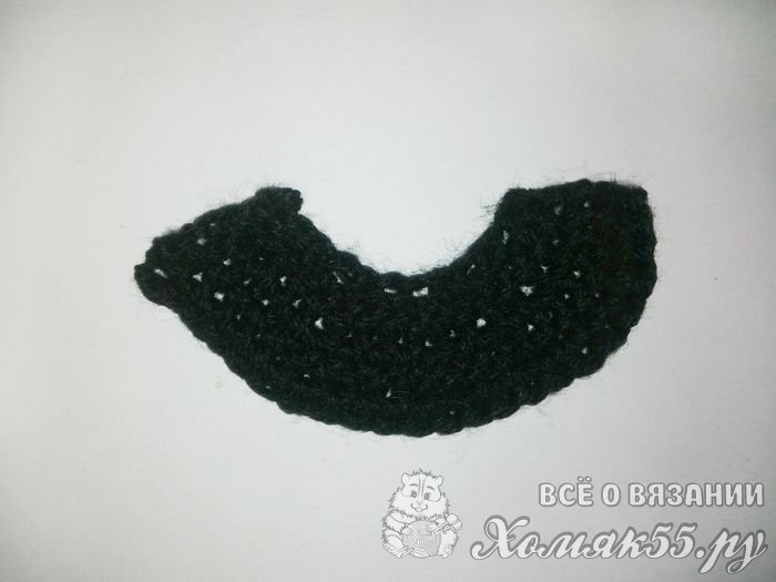 Делаем шесть прибавок и в другом ряду еще четыре. Вяжем четыре ряда. Пятый ряд вяжем полностью черной пряжей. С шестого ряда начинаем делать по шесть убавок до закрытия отверстия. И вышиваем челку черными нитками. Просто делаем пару стежков.