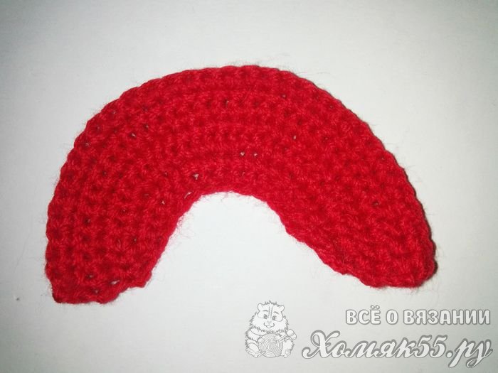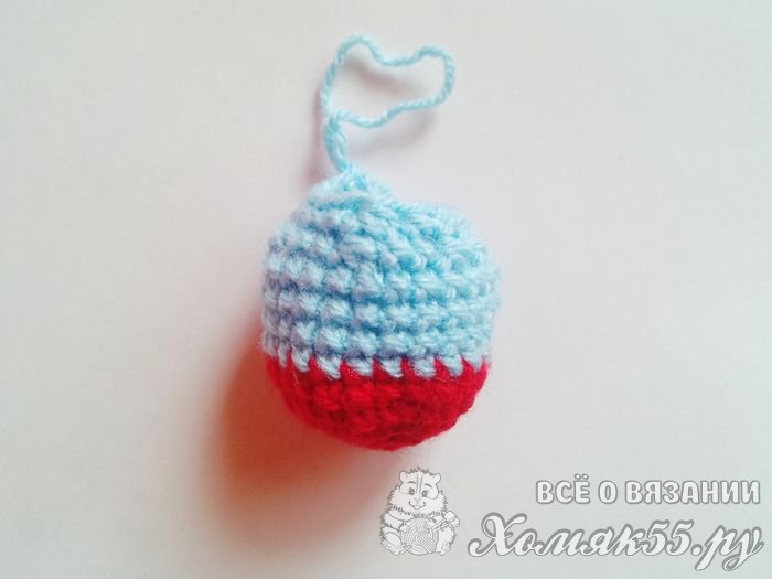 Сначала сделаем кольцо амигуруми и провяжем туда шесть столбиков красной пряжей. Сделаем в трех рядах прибавки и провяжем еще один ряд. Меняем на голубую и вяжем четыре ряда. Делаем в следующем ряду шесть убавок и еще четыре в следующем.