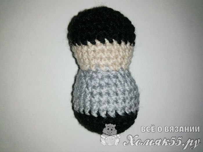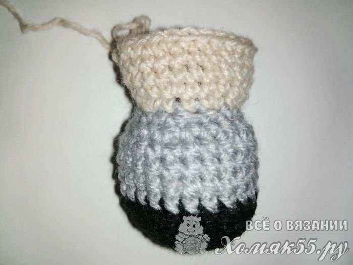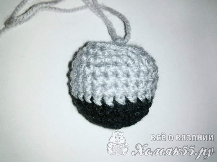Сменим ниточку на серую. Свяжем четыре ряда, убавим в пятом сером ряду на шесть петель. И в следующем ряду убавим четыре столбика.