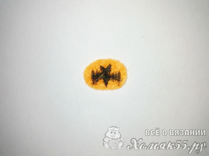Из желтого фетра вырезаем овал и черной краской рисуем знак Бэтмена.