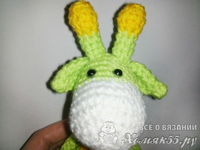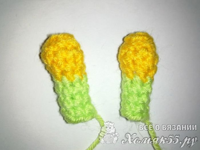 Теперь свяжем рожки. Их тоже начнем вязать желтыми нитками. Сначала делаем скользящую петельку, в которую мы будем вязать шесть столбиков. И сделаем три прибавления во втором рядке. Провяжем один ряд и в следующем сделаем две убавки. У нас останется семь петель. Поменяем нитки на зеленые и провяжем 4-ре ряда.