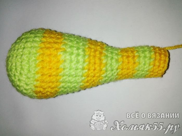 Далее идет желтая полоска и значит желтая нитка. Но здесь делаем не шесть убавок, а всего 4-ре. И провязываем два ряда. Теперь у нас идет зеленая полоска. Убавляем 4-ре столбика и вяжем один ряд. Делаем еще 4-ре убавки и меняем на желтую. Вяжем желтыми нитками без убавок три ряда. Далее три ряда зелеными и еще три ряда желтыми.