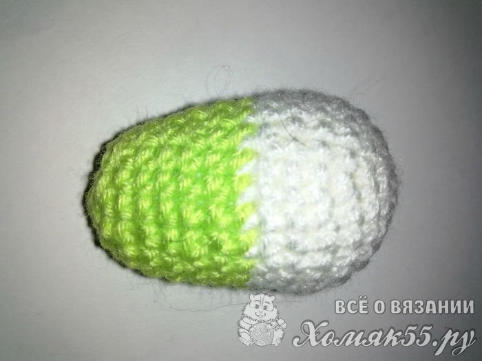 Тело вязать будем сначала зелеными нитками, а потом добавим желтые и будем чередовать. В кольцо амигуруми провяжем шесть столбцов. В пяти других рядах будем делать по шесть прибавлений. Провяжем ряд. Теперь присоединяем желтую ниточку. Делаем шесть убавок и вяжем два ряда. Снова меняем нитку на зеленую. И тоже делаем шесть убавок. Вяжем два ряда.