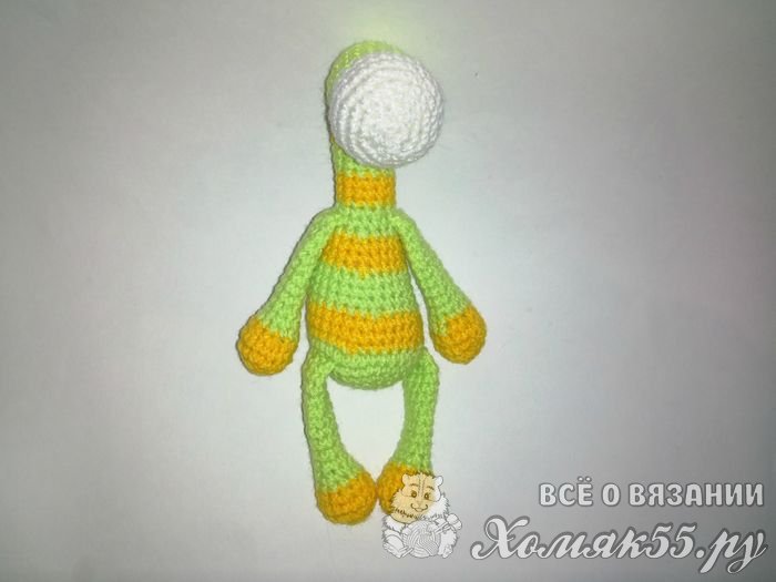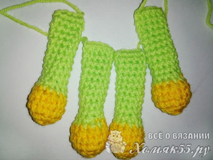 Ножки и ручки у жирафика вяжутся одинаково. Начинаем вязать желтыми нитками. Делаем шесть столбцов в колечко амигуруми и дальше сделаем по шесть прибавлений в двух рядах. Провяжем ряд без прибавлений и в последнем желтом ряду сделаем шесть убавок. Сменим нитки на зеленые и ими провяжем девять рядов. Набьем синтепоном только желтую часть.