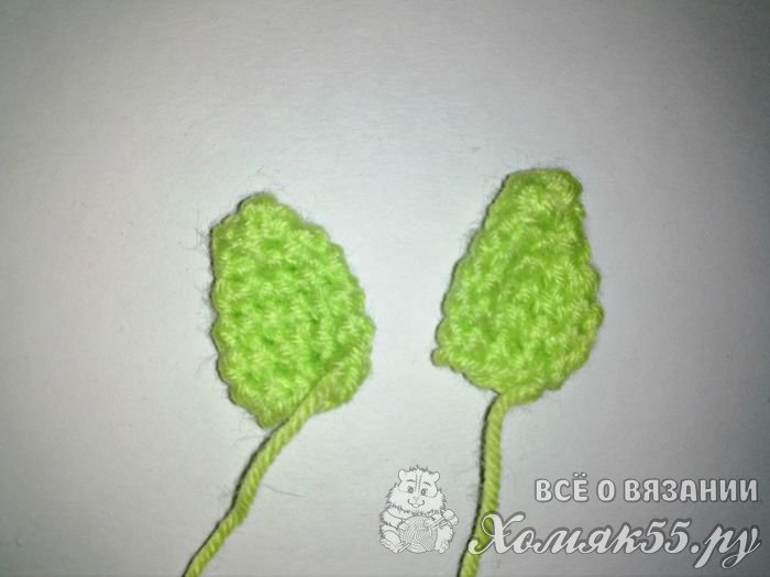 Ушки сделаем полностью зелеными. Свяжем шесть столбцов в начальную петлю. Провяжем ряд столбиками без накида. Сделаем по три прибавления в двух рядах. Провяжем ряд. И сделаем три убавки. Ушки для жирафа готовы.