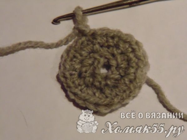 Делаем одну воздушную петлю для подъема на следующий ряд и начинаем увеличивать количество петель. Из основания каждой петли вывязываем два столбика без накида. Получается, что второй ряд составил у нас 12 петель.