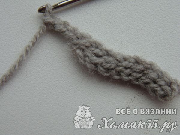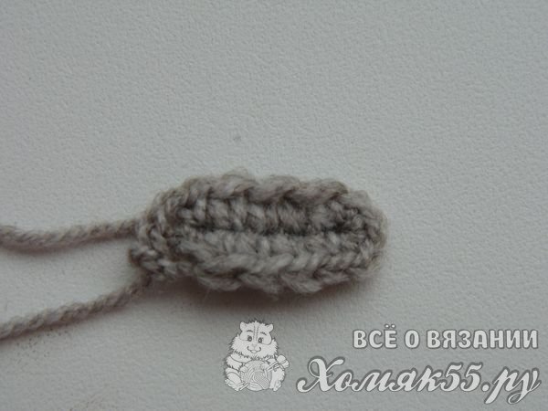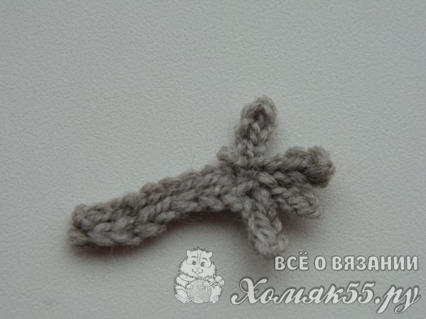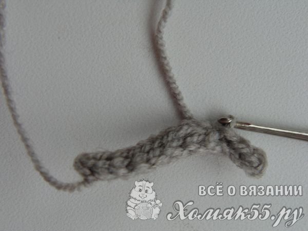 Самыми простыми по вязанию являются нижние лапки и хвост. Лапки вяжутся из шести воздушных петель, которые с двух сторон обвязаны столбиками без накида.