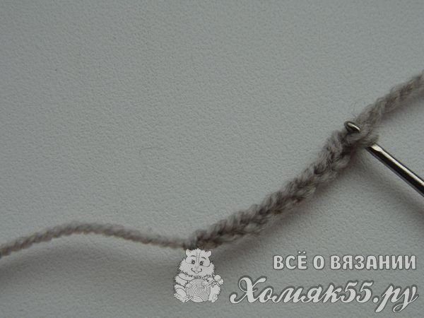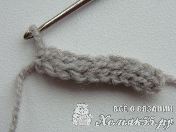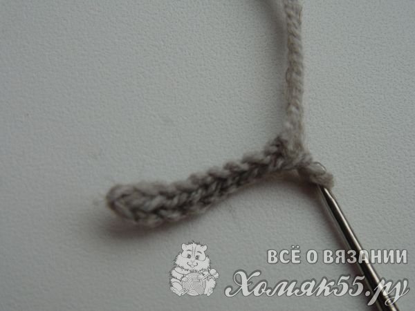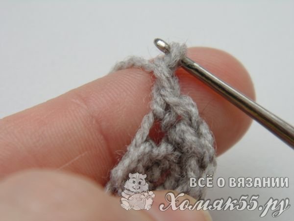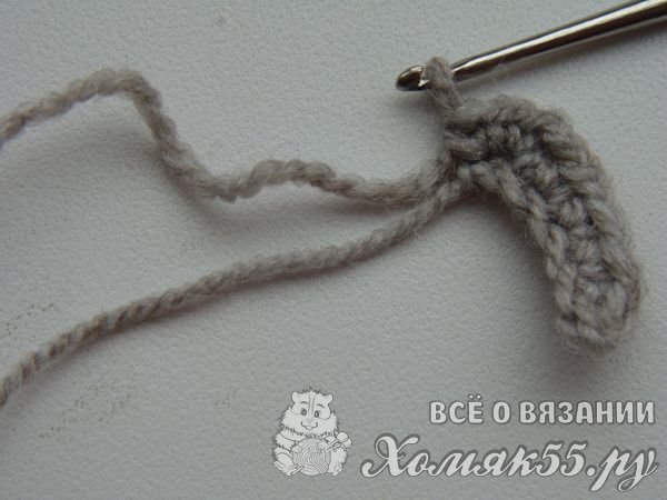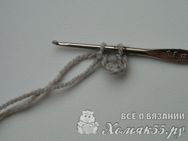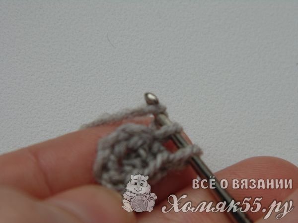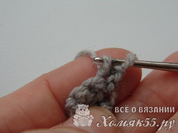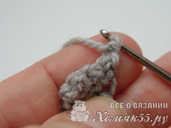 Вводим крючок во вторую петлю и вывязываем полустолбик. Аналогично проделываем с первой петлей у основания.