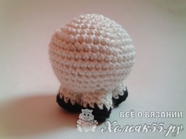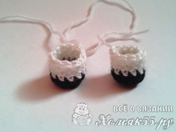 Ножки будем вязать черной и белой пряжей. Сделаем черными нитками шесть столбиков в петельку. Прибавим еще шесть в новом ряду. И ряд выполним за заднюю часть петель.