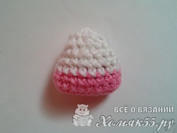 Теперь свяжем голову. У коровки она будет двухцветной: розовой и белой. Розовой будет нос.