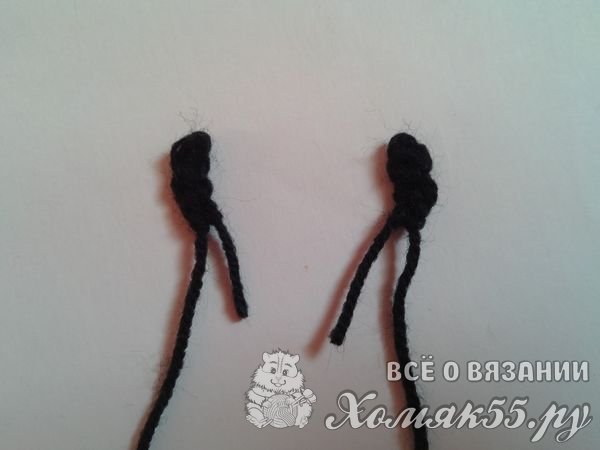 Рога сделаем черными. Делаем четыре петли и их провязываем соединительными столбиками.
