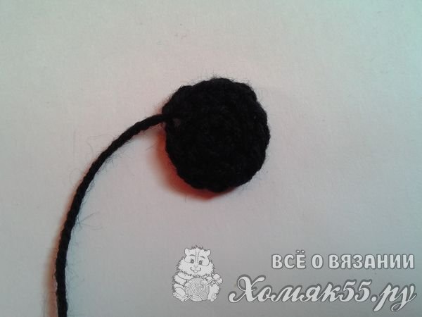 Вышиваем носик черной пряжей. И сделаем хвостик из шести петель, провязанных соединительными столбцами. На конце сделаем кисточку из белой и черной пряжи.