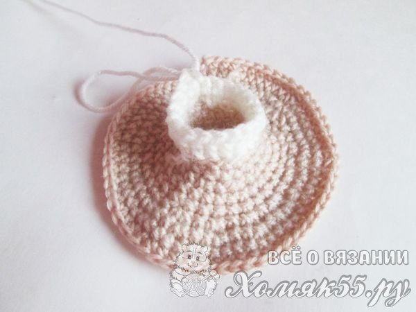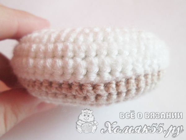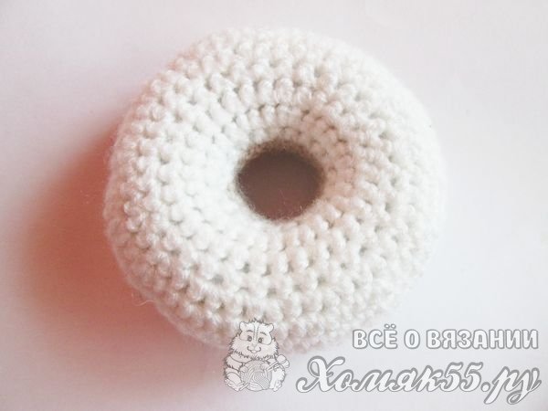 Одна часть нашего пончика уже готова. И теперь будем вязать его верхнюю часть, а именно – глазурь. Ее можно сделать любого цвета. В данном случае это белый цвет пряжи. Мы присоединяем нитку к отверстию и провязываем два рядочка.