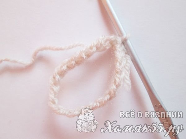 Наберем в самом начале вязания цепочку из двадцати петель. И ее мы замкнем в колечко. Вяжем пряжей песочного цвета. Это у нас будет цвет теста будущего пончика.