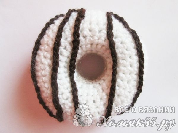 И теперь пришиваем ее к пончику, имитируя шоколадную полоску. Пришиваем шоколад вытянутыми волнами от одного края к другому.