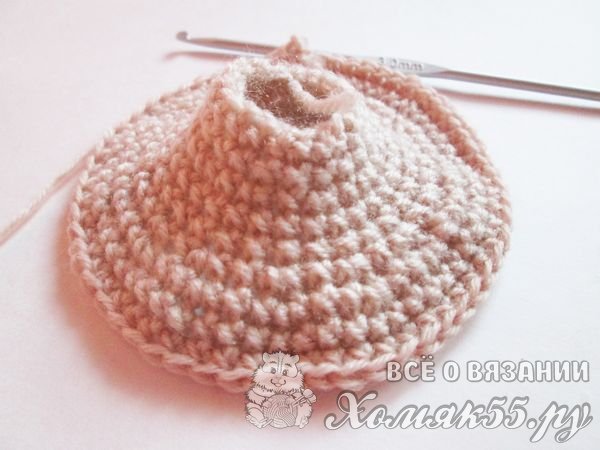 Дальше начнем постепенно расширять вязание. Сделаем некоторые прибавки. Мы провяжем столбик, а в другой провяжем два. И так будем вязать весь этот ряд.