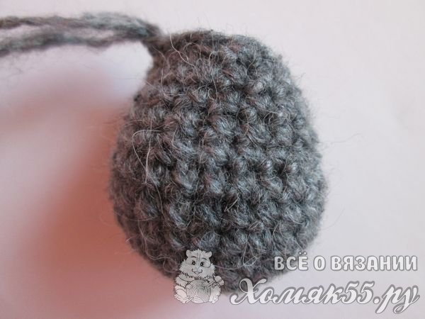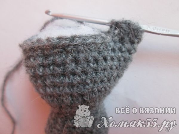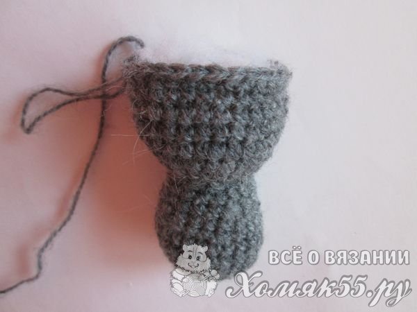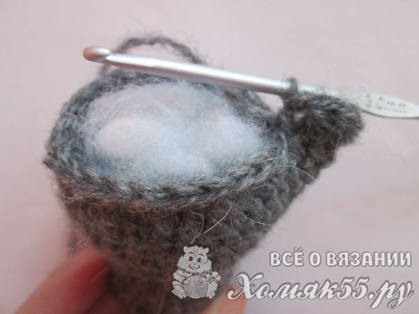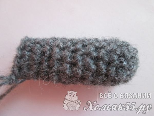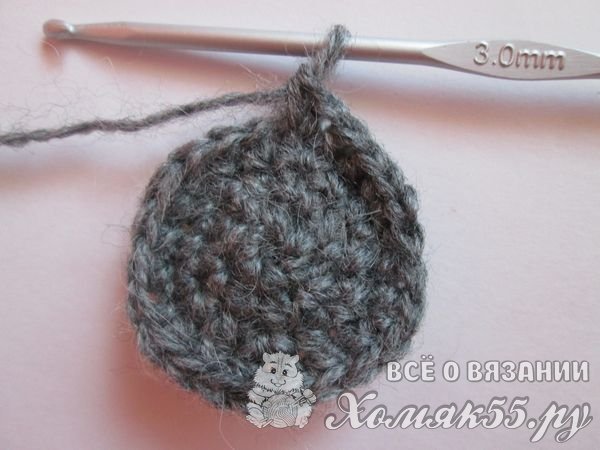 Вяжем серенький хвостик. Выполняем шесть СбН в петельку. И во втором рядочке вывязываем СбН, два СбН в петлю. И так чередуем. А дальше просто вяжем СбН девять-десять рядов.
