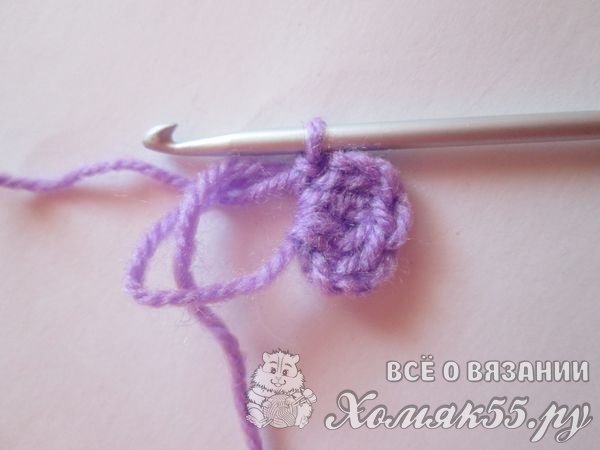Сначала мы вывязываем шесть СбН в петельку. Далее по два СбН в каждую петлю. Далее вязать будем так: