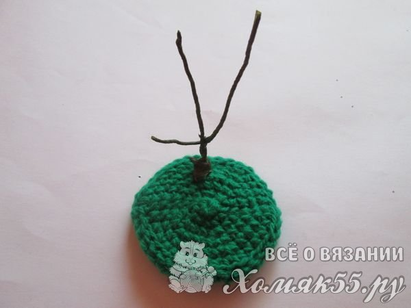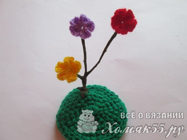 Таких цветочков свяжем три разных цветов. Теперь мастерим из проволоки веточки и обматываем их тейп-лентой. Крепим проволоку к полянке.