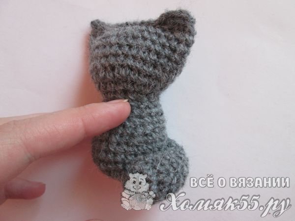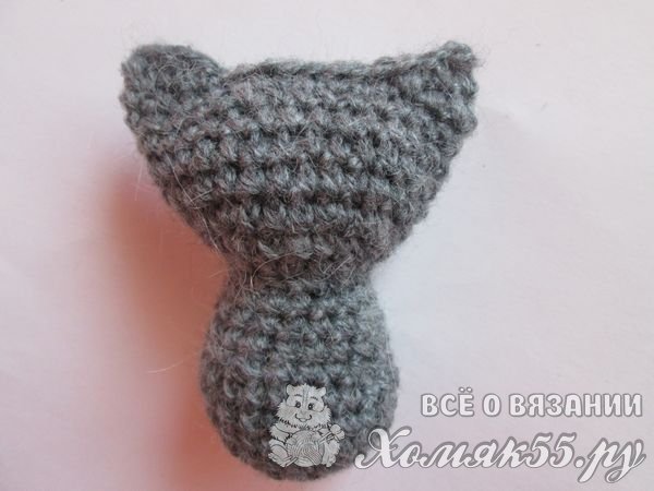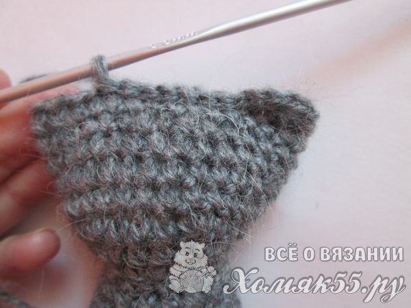 Теперь будем вязать ряд, вводя крючок под обе стороны головы. Начинаем с уголка и вывязываем ушки котенку.