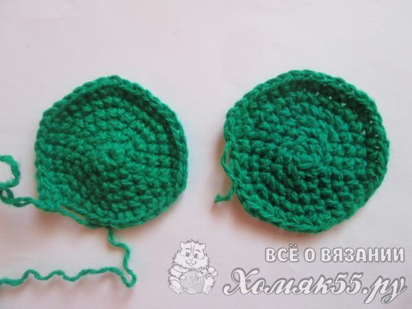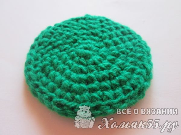 Теперь переходим к вязанию полянки. Мы выполняем шесть СбН зеленого цвета. И далее будем делать прибавки СбН. В каждом из пяти рядов добавим по шесть новых СбН. Таких детали нужно две.