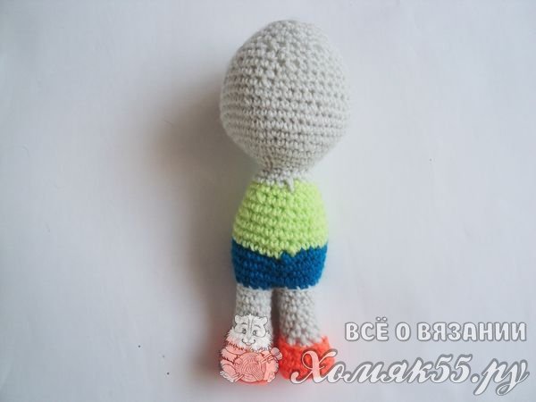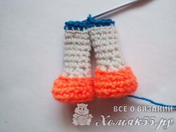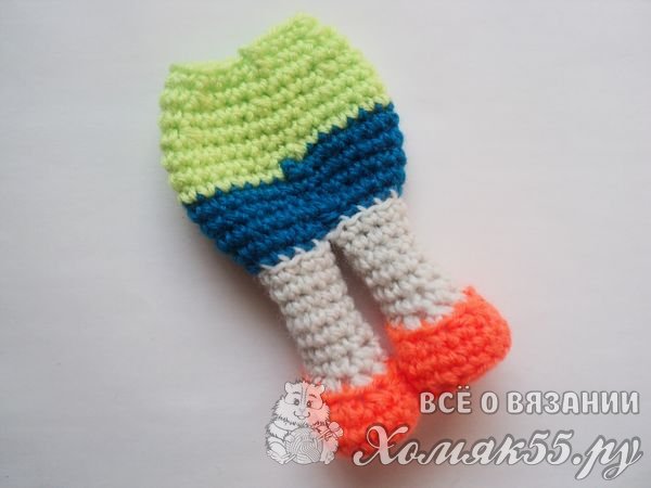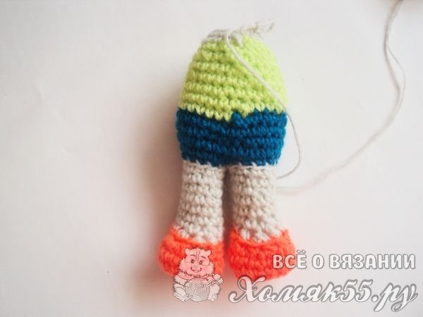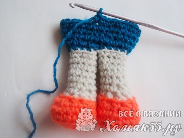 Вяжем вторую такую же лапку. Теперь соединяем ножки синей пряжей. Набиваем наполнителем.