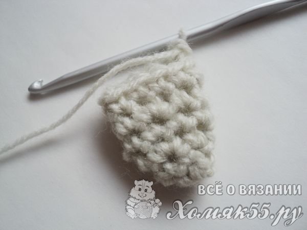 Снова вяжем 3 СБН, далее 2 убавки подряд. В остальные петли провязываем по 1 СБН. Далее 6 рядов вяжем по 1 СБН.