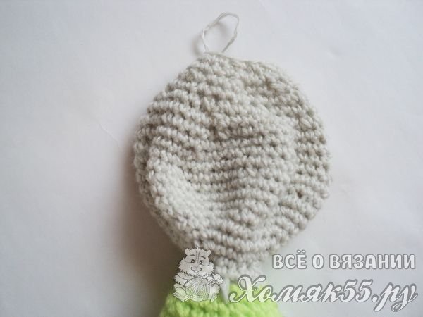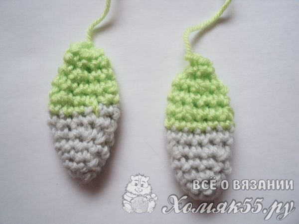 Меняем нить на зеленую. Вяжем 3 ряда без изменений. Теперь убавляем. Вяжем 3 СБН и 1 убавку. И так весь ряд. 1 ряд вяжем без убавок. И снова убавляем. 2 СБН и убавка. Так до конца. 1 ряд без убавок. Убавляем через петлю. Набиваем наполнителем.