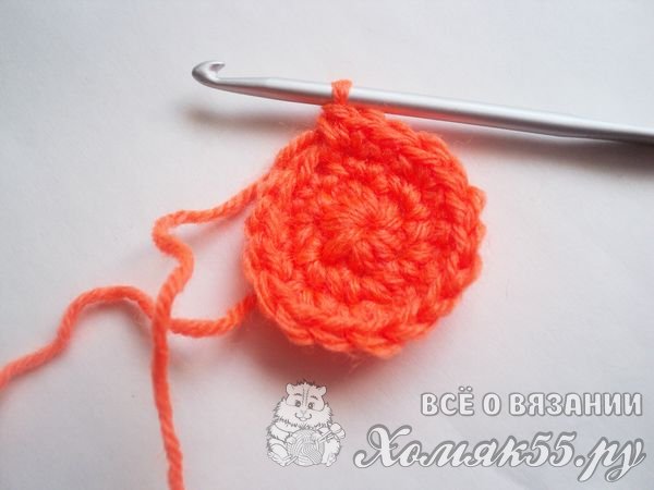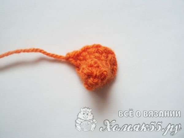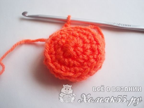 Начинать вязание будем с ног. Набираем кольцо амигуруми из 6 петель оранжевой пряжей. Во втором ряду прибавляем в каждую петлю. В третьем ряду прибавку осуществляем в каждую вторую петлю. У нас получается кольцо из 18 петель. Теперь будем вязать по 1 петле в каждую петельку предыдущего ряда. Но вяжем только за заднюю стенку петли.