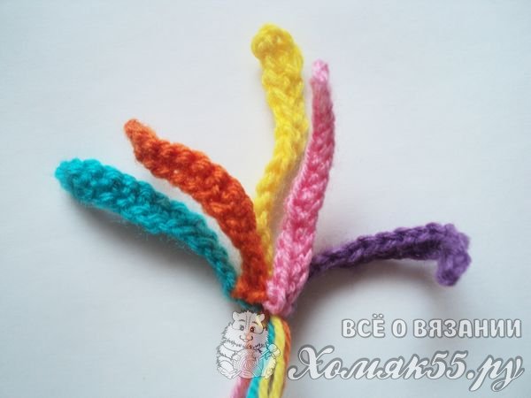 Осталось связать хвост. Набираем цепочку из 15 петель любым цветом. Разворачиваемся и вяжем СБН по 1 в каждую. Таких элементов можно связать сколько угодно. Вяжем каждую цепочку другим цветом.