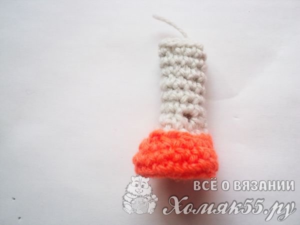 Теперь меняем цвет пряжи на цвет лапок петушка. Вяжем за заднюю стенку петли 4 СБН, 3 убавки подряд и далее по 1 СБН.