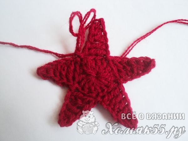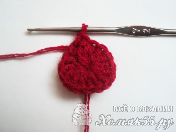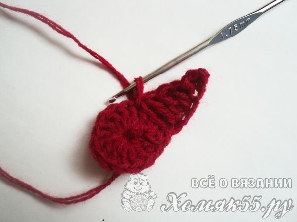 Красной пряжей формируем скользящую петлю. Провязываем 3 воздушные петли. И теперь в скользящую петлю вяжем 14 столбиков с накидом. Соединяемся в 3 воздушную петлю первой цепочки.