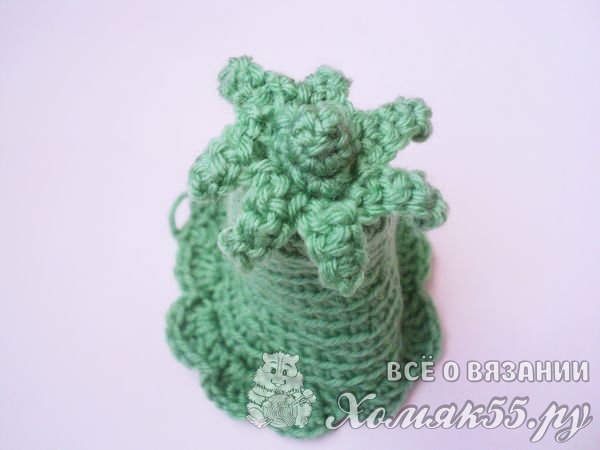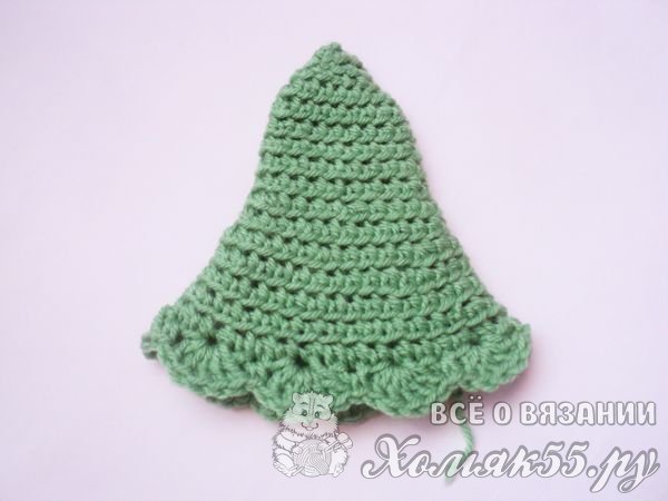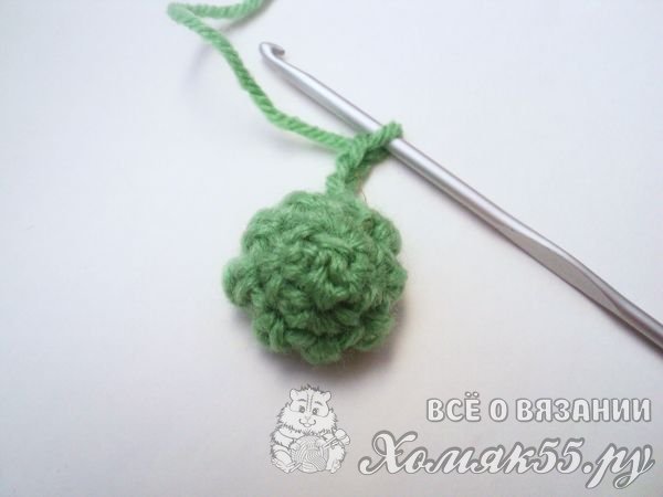 Теперь будем провязываем веточки. Оставляем немного места для макушки и присоединяемся за любую не провязанную часть петли сверху. Вяжем 4 воздушные петли. В 3-ю петлю от крючка провязываем 1 столбик без накида и так вяжем до конца. Заводим крючок в новую часть петельки и вяжем соединительный столбик. Снова набираем 4 воздушные и повторяем действия. Так вяжем по кругу.