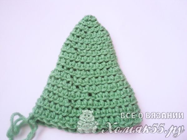 Дальшем мы провяжем по 2 столбика без накида в каждый столбик нижнего ряда. Так мы увеличим количество петель в 2 раза. Все последующие ряды мы будем вязать, заводя крючок только за заднюю стенку петель. В новом ряду мы провяжем по следующей схеме: 1-2-1-2. Мы снова увеличили количество петель. В новом ряду нам нужно еще раз провязать с прибавками. Вяжем по схеме: 1-1-2.